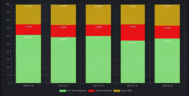 The integrated reporting system provides analytical historical reports about Factory efficiency, time usage, alarms & downtimes, production quantities, product cycle times, workstations, and operators with compare capabilities. (Export to excel sheets is supported)