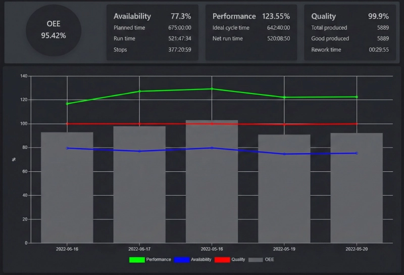 Overall Equipment Effectiveness is the main Key Performance Indicator provided by Epoptia MES.