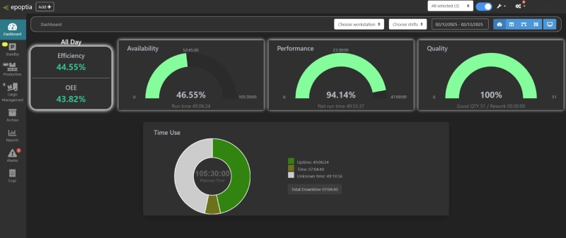 Epoptia Dashboards are comprehensive showing live efficiency, time usage, downtimes, and other meaningful production insights.