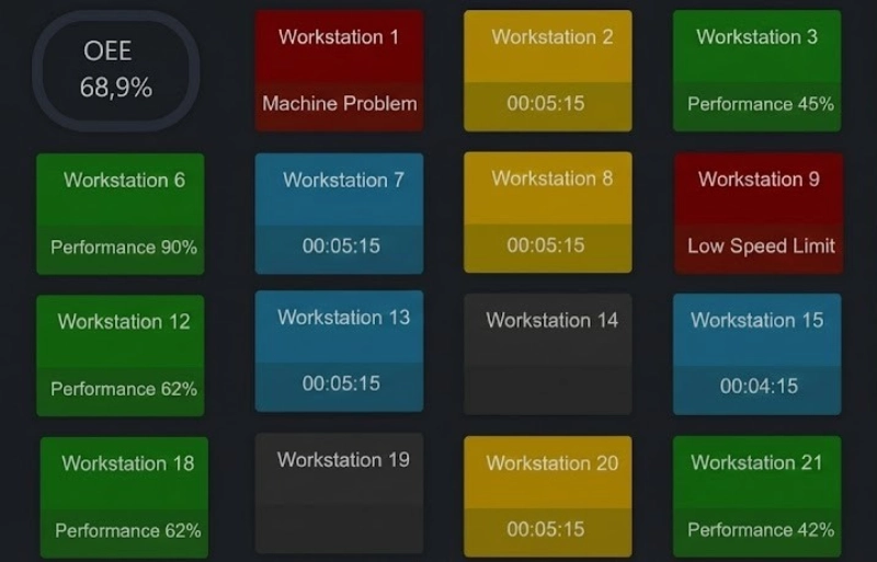 Depending on the workload and actual situation of the production, indications are displayed to inform you about overload resources, alarms, and downtimes.